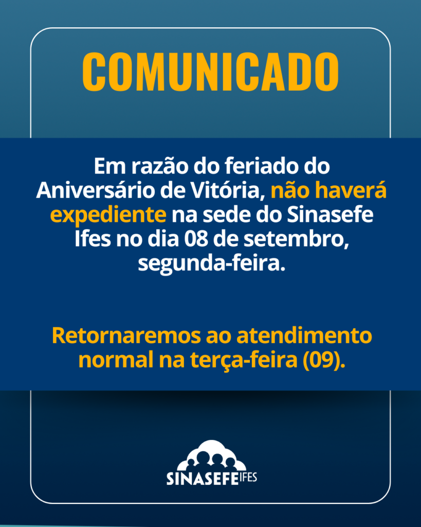 Informamos às/aos servidoras/es, filiadas/os e à comunidade em geral que, em função do feriado municipal em celebração ao Aniversário de Vitória, não haverá expediente na sede do Sinasefe Ifes na próxima segunda-feira, 08 de setembro. As atividades e atendimentos retornarão normalmente na terça-feira, 09 de setembro. Contamos com a compreensão de todas/os e desejamos um bom feriado!