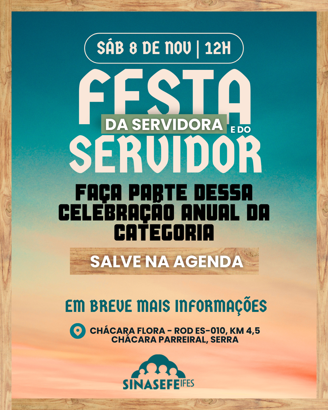 O Sinasefe Ifes realizará sua grande festa no dia 8 de novembro, a partir das 12 horas, na Chácara Flora. O evento promete ser um momento de confraternização e lazer, reunindo servidoras e servidores em um ambiente descontraído e festivo. A programação contará com piscina liberada, buffet de churrasco e a animação da banda Som & Cia, garantindo música ao vivo e diversão durante todo o dia.