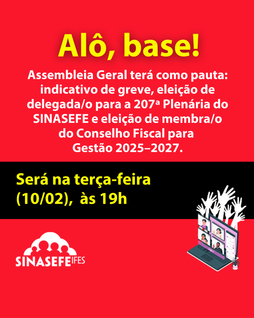 O SINASEFE IFES convoca servidoras/es para uma importante Assembleia Geral Virtual, que acontecerá na próxima terça-feira (10/02/2025), às 19h. 🗓️ PAUTA: 1️⃣ Informes Gerais 2️⃣ Indicativo de Greve 3️⃣ Eleição de delegada/o para a 207ª Plenária do SINASEFE 4️⃣ Eleição de membra/o do Conselho Fiscal – Gestão 2025–2027 🕒 Primeira chamada: 19h, com quórum mínimo de 1/3 das/os sindicalizadas/os 🕒 Segunda chamada: 19h15, com qualquer número de sindicalizadas/os, conforme determina o art. 10º, §3º do Regimento Interno do SINASEFE IFES. 💻 Modalidade: Virtual – Plataforma Cisco Webex 🔗 Link: CLIQUE AQUI E PARTICIPE! 🔑 Senha: ifes (minúsculo) 🗣️ Participe! A presença de todas/os é fundamental para fortalecer a luta coletiva e as decisões da categoria ✊