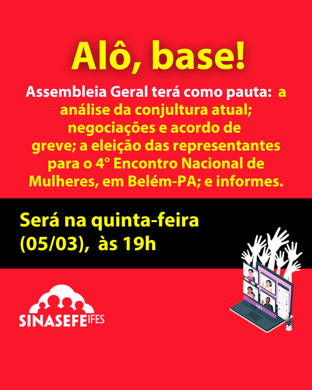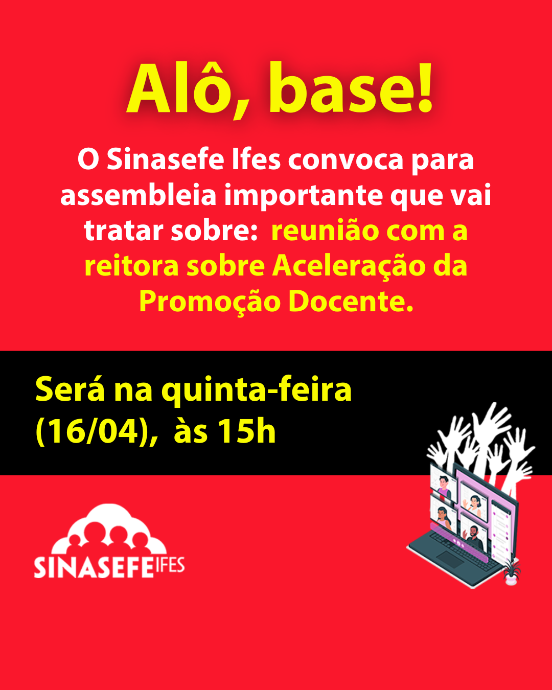 📣 O Sinasefe Ifes convoca servidoras/es para uma importante Assembleia Geral Virtual, que acontecerá na próxima terça-feira (07/04/2026), às 19h.