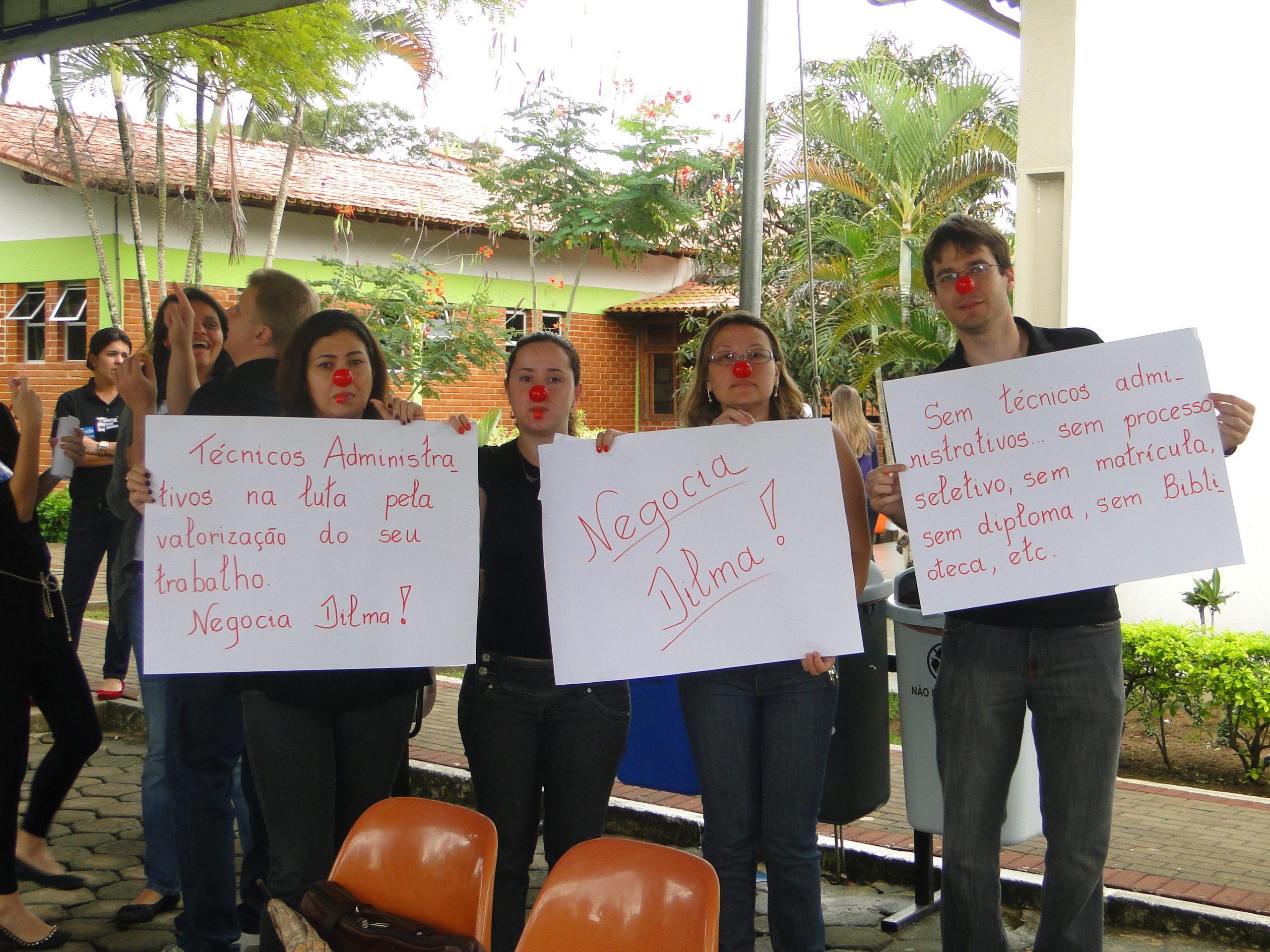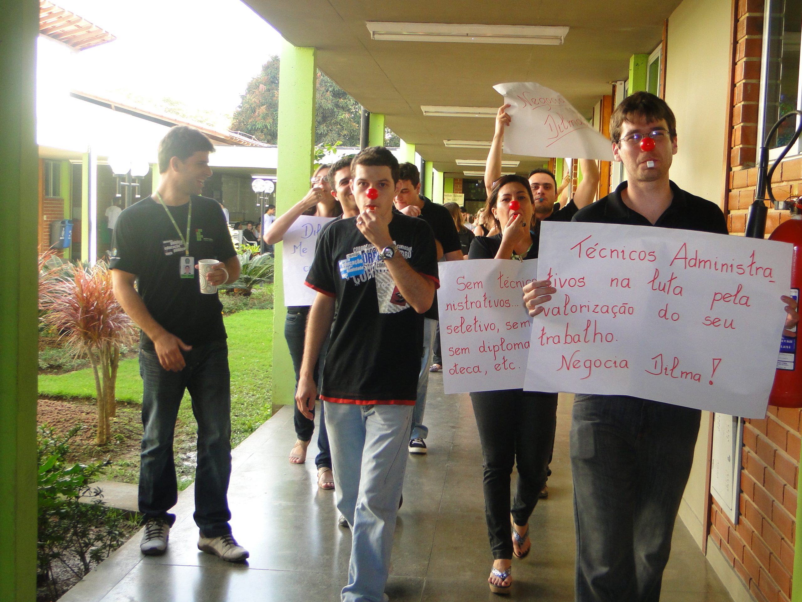 Os servidores reuniram-se em frente ao Campus no começo do dia para um café da manhã solidário. Na hora do intervalo, portando faixas e cartazes, os TAE passaram pelo campus em apitaço e dialogaram com estudantes e servidores que não participavam da mobilização.