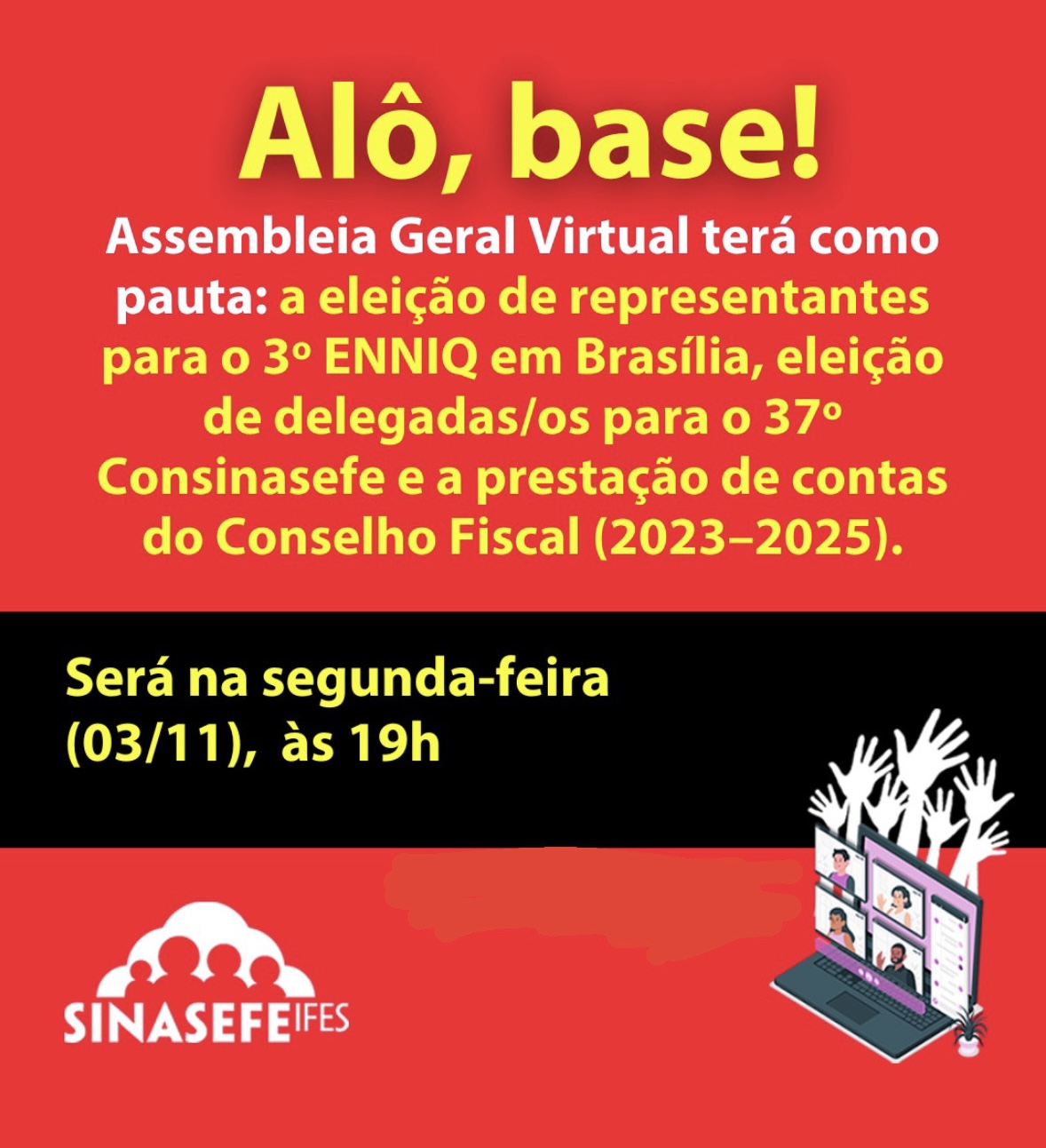 O Sinasefe Ifes convoca todas/os as/os servidoras/es para uma importante Assembleia Geral Virtual, que acontecerá na quinta-feira (03/11), às 19h.