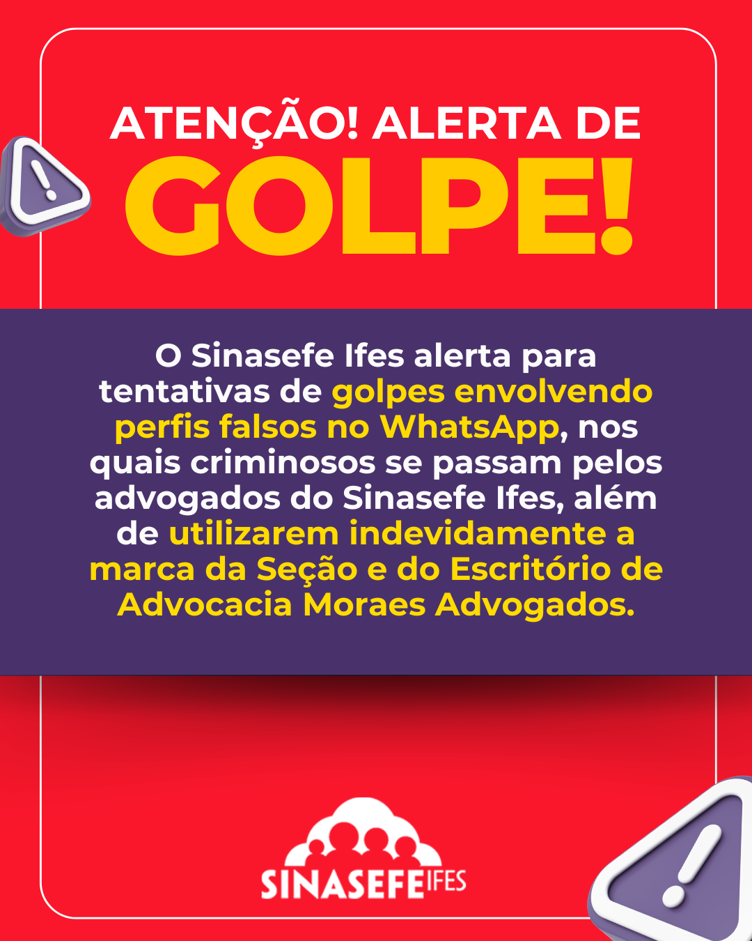 Comunicamos que o Sinasefe Ifes e o Escritório Moraes Advogados Associados nunca solicitam informações bancárias, dados pessoais, pagamentos prévios, ou transferências bancárias para liberar valores. Recentemente, criminosos têm se passado pelos advogados Adriano Moraes e Thiago Calhau, e também pelo próprio Sinasefe Ifes, utilizando perfis falsos no WhatsApp.