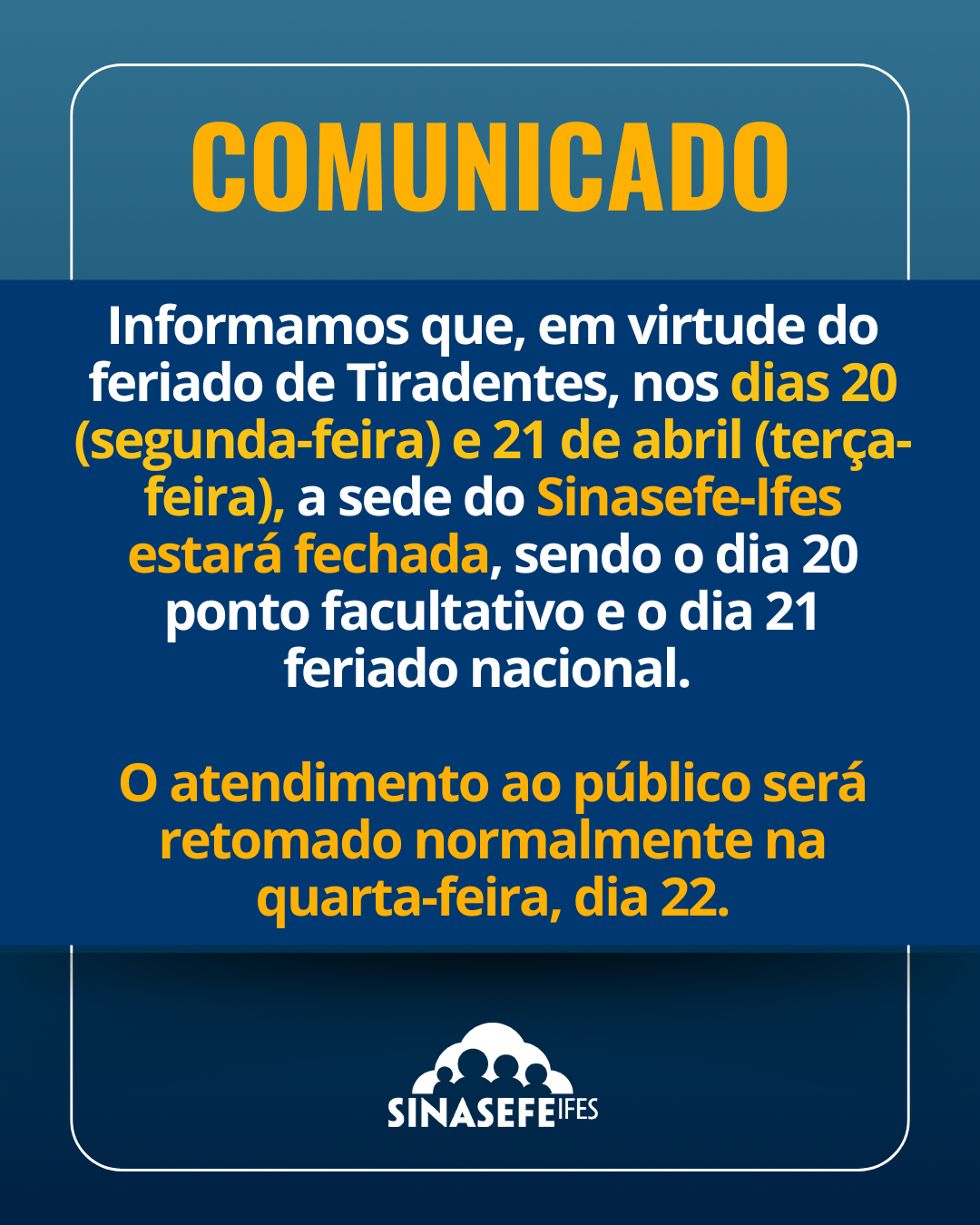 Em virtude do feriado de Tiradentes, a sede do Sinasefe-Ifes estará fechada nos dias 20 (segunda-feira) e 21 de abril (terça-feira), sendo o dia 20 ponto facultativo e o dia 21 feriado nacional. O atendimento ao público será retomado na quarta-feira, dia 22 de abril, às 8h.